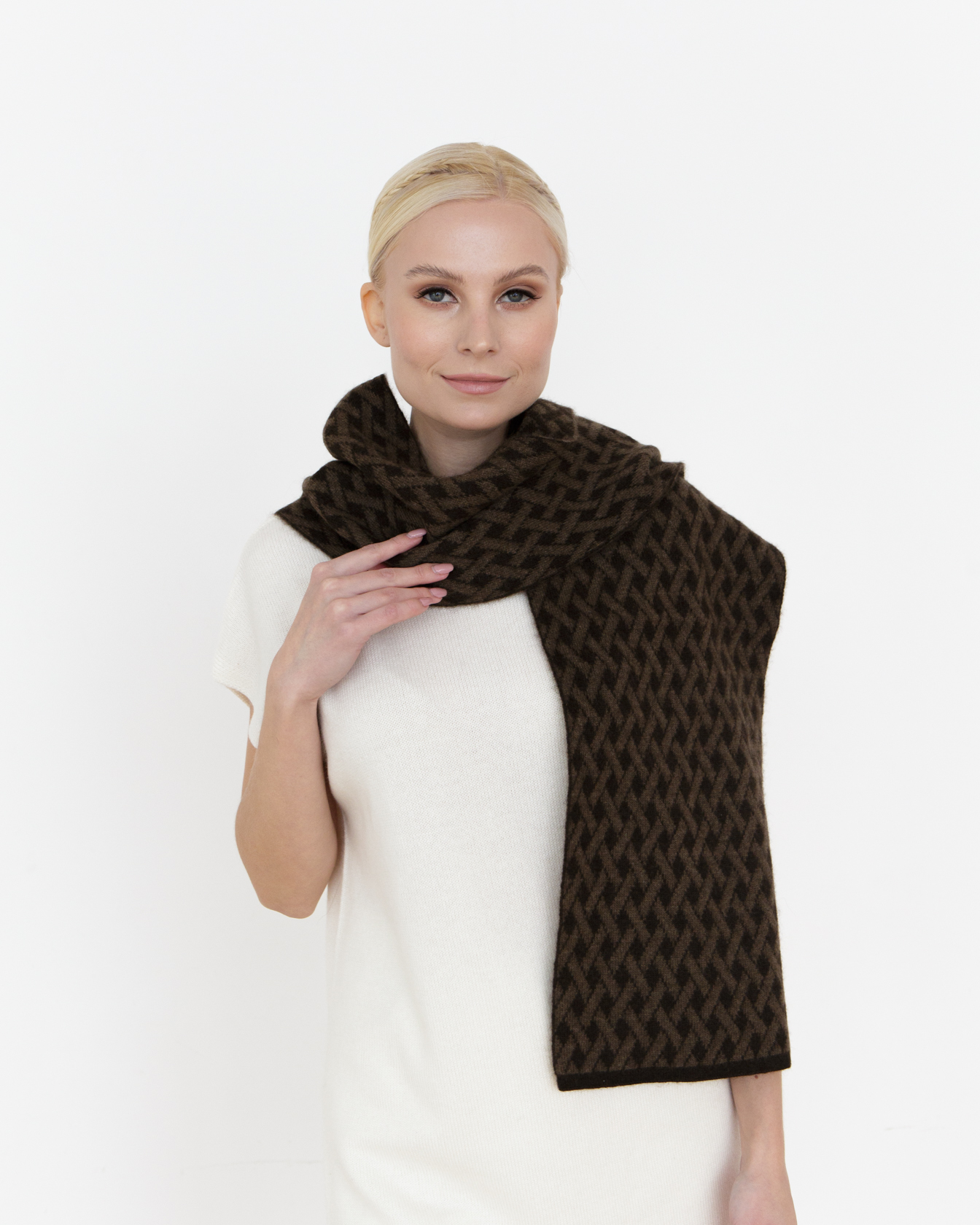 Элегантный шарф из пуха яка — теплый и выразительный аксессуар для холодного сезона. Модель привлекает внимание фактурным геометрическим узором и благородной цветовой гаммой. Шарф легко дополняет повседневные и элегантные образы, создавая ощущение уюта и стиля.