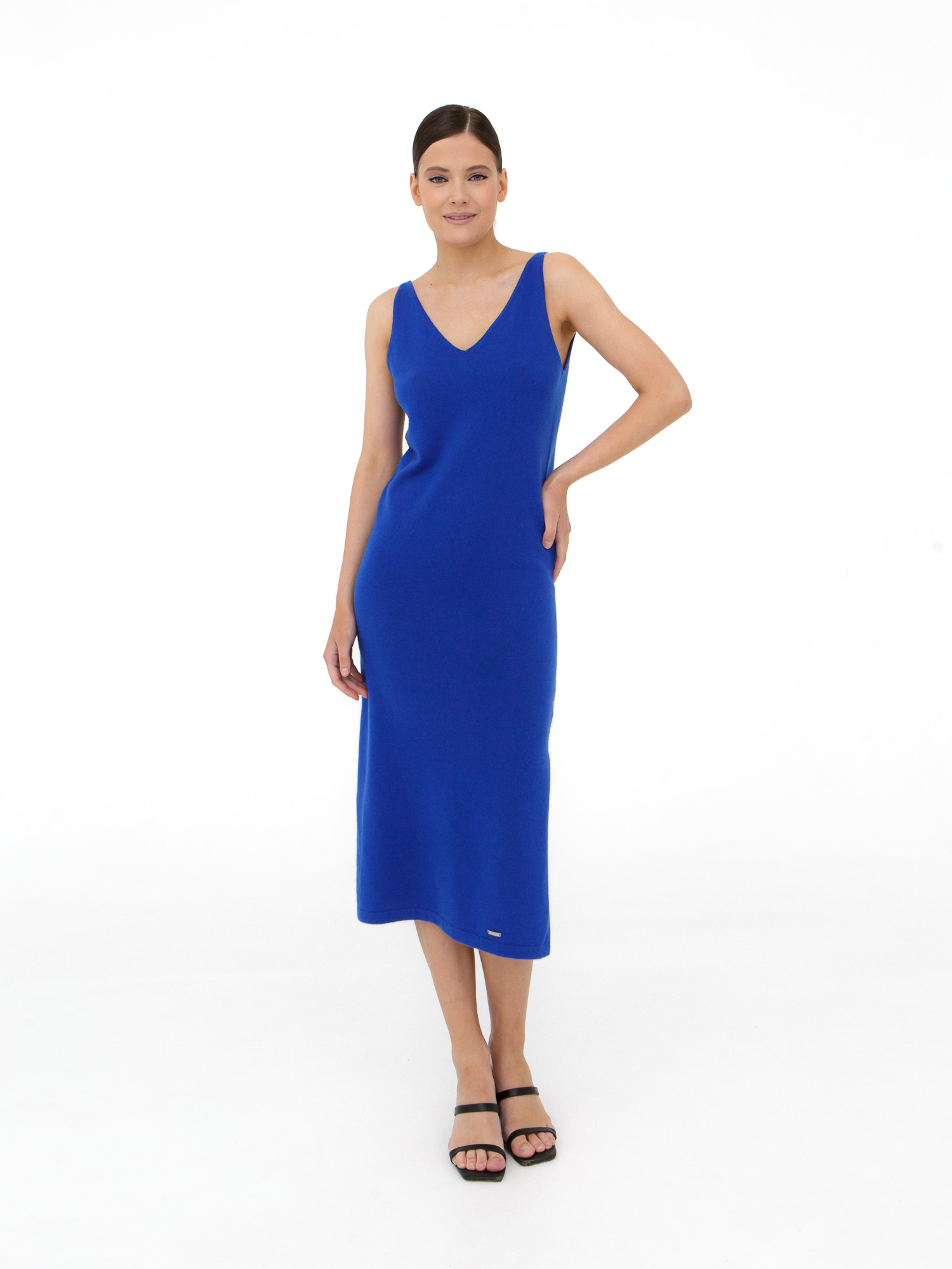 V-образный вырез, аккуратные бретели, боковой разрез для свободы движения. Минималистичный дизайн подчёркивает благородство материала.